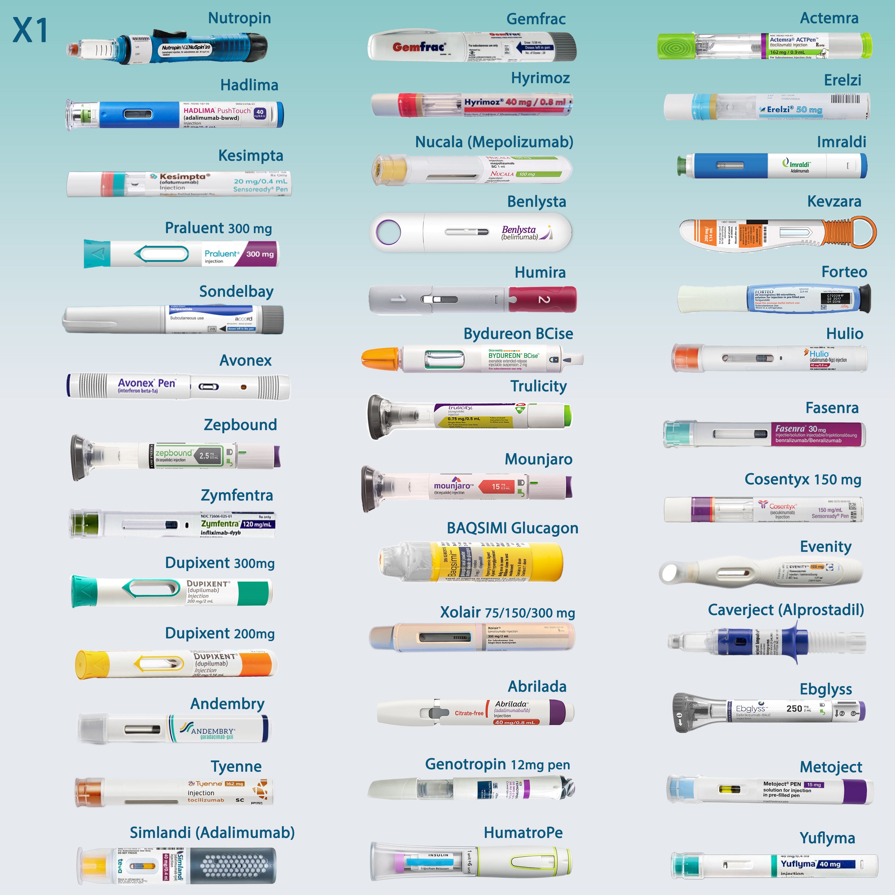 Cela inclut notamment les traitements contre les allergies comme l’EpiPen, les injections pour la polyarthrite rhumatoïde (telles que Humira ou Enbrel), les traitements contre les migraines (Aimovig, Emgality), les collyres, les injections pour la sclérose en plaques, la thérapie de remplacement de la testostérone, les traitements contre la dysfonction érectile comme le Trimix, l’ostéoporose (Prolia, Xgeva, Forteo), le cholestérol (Repatha, Praluent), les vaccins, le Botox, ou encore l’eczéma avec Dupixent.